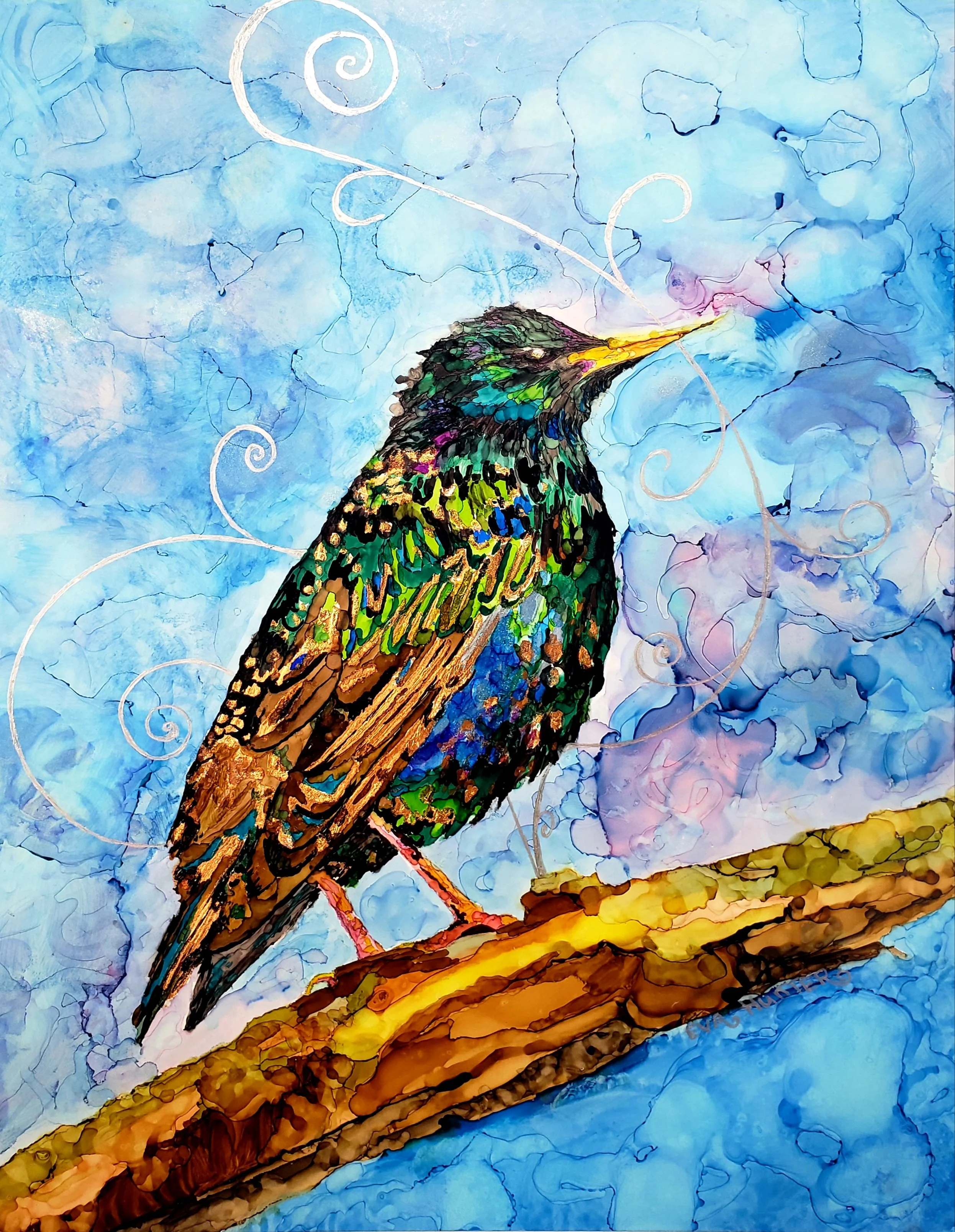 “Starling” an alcohol ink and copper foil, original painting by Eva. During the class at The Art Store on Jan. 24th, students will work on a similar painting.